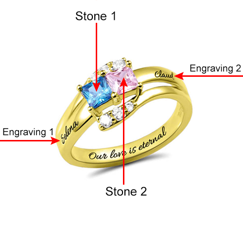 It takes two special people to create a bond that promises happiness forever and always. Now, wear a dazzling expression of how wonderful it is to have someone who makes you feel this way with the Love's Promise ring. Customized with 2 crystal birthstones and 2 engraved names, this 2 stone birthstone ring is a beautiful symbol of the forever love between you and your significant other. Carry the reminder of your bond with you always with double cubic zirconia square-shaped stones each to represent your different birth months.Engraved on either side of the crystals are your names or any special word up to 8 characters. Select the birthstone color of your choice and we'll place them in this beautiful setting. Made with solid 925 sterling silver, the customized zirconias make a beautiful gift that she will treasure forever. Engrave the inside of these bands with a special date, names, or a special message for a personalized touch. These customizable rings make an unforgettable birthday, Mother's Day, or just because gift. Womens sizes 6 to 12 available. Order now!